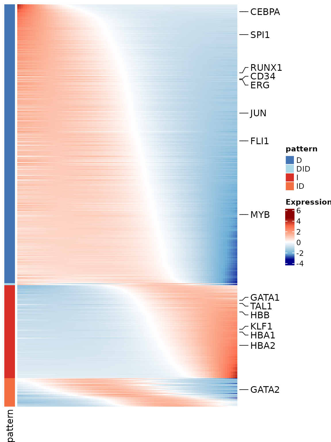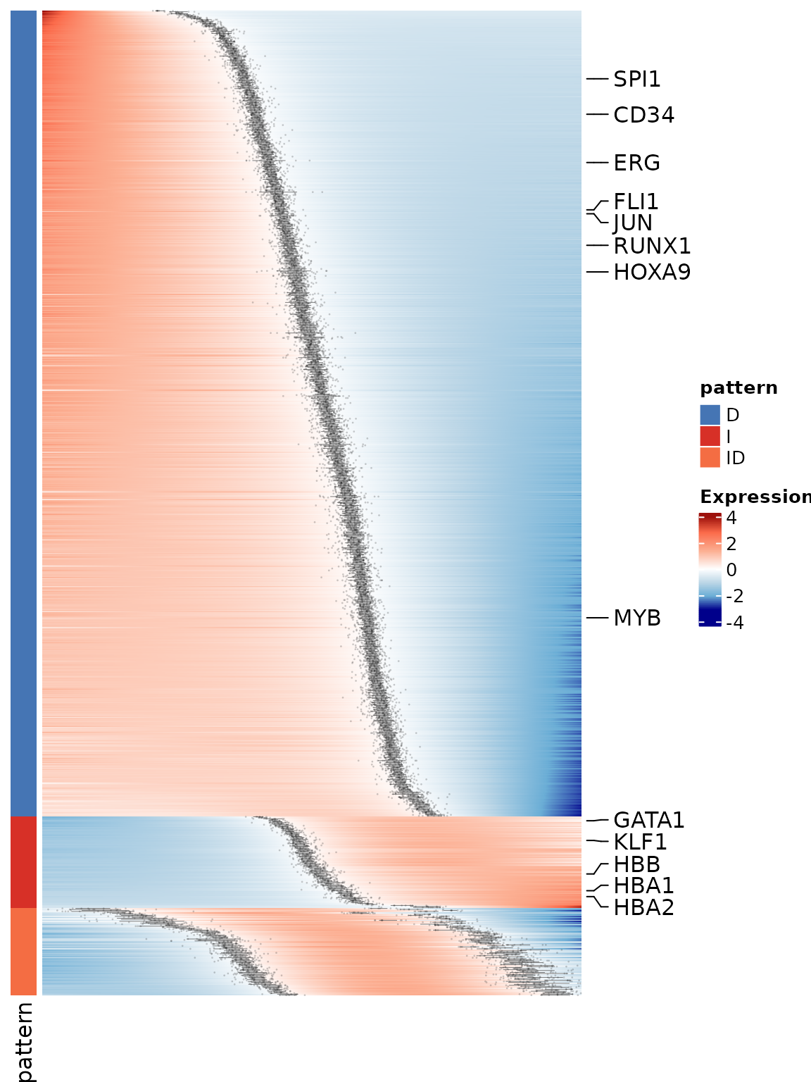 In addition to these filtered genes, we also highlight a set of manually chosen marker genes relevant for hematopoietic differentiation. These marker genes are annotated on the heatmap, making it easier to track known regulators and to interpret the overall expression trends in a biological context.